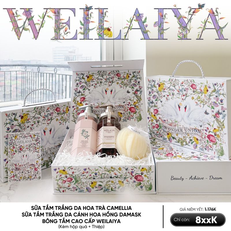 Hộp quà Thiên Nga gồm Sữa tắm Hoa Trà Hoa Hồng và Bông tắm Weilaiya
