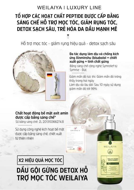 - Xinminshu (bisabolol + chiết xuất gừng + tinh chất gừng gừng Vân Nam ở dạng Phân Tử) kết hợp với Bằng sáng chế Công nghệ Symrelief từ Symrise - Đức được Weilaiya mua Độc Quyền giúp X2 hiệu quả hỗ trợ mọc tóc, giảm rụng tóc. Công thức này tạo ra 1 dạng hoạt chất mạnh mẽ hỗ trợ mọc tóc nhanh, giảm rụng tóc hiệu quả vượt trội.